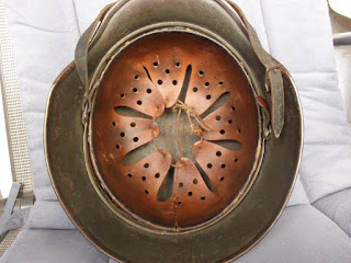 l'origine feldgrau, le casque a reçu une bonne couche de peinture verte foncée, dans un soucis de camouflage. Complet avec son cuir, lacet et sa jugulaire originale. Pièce jus garantie